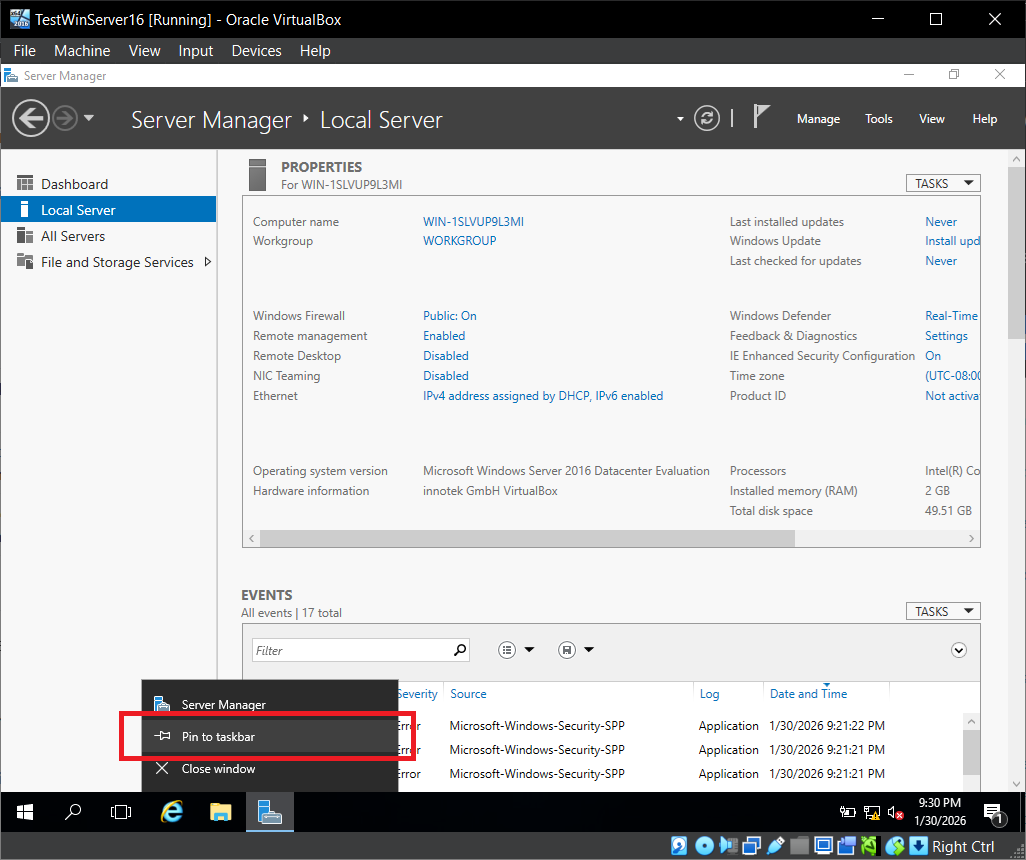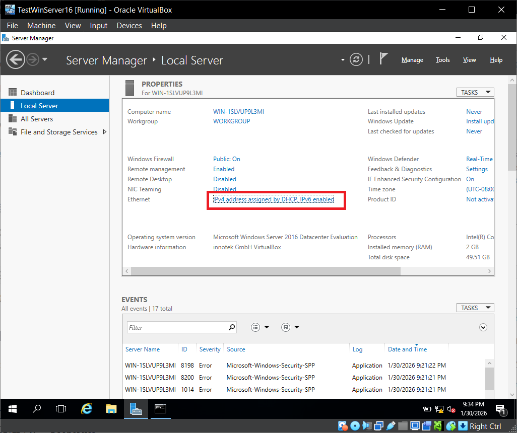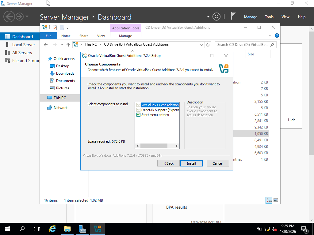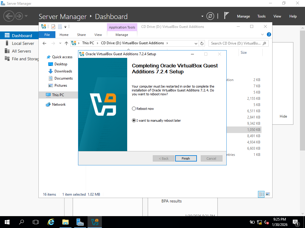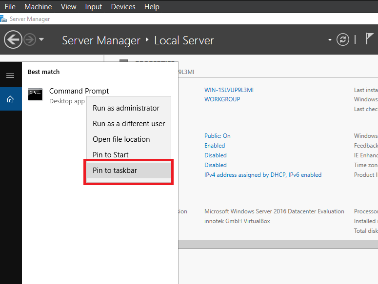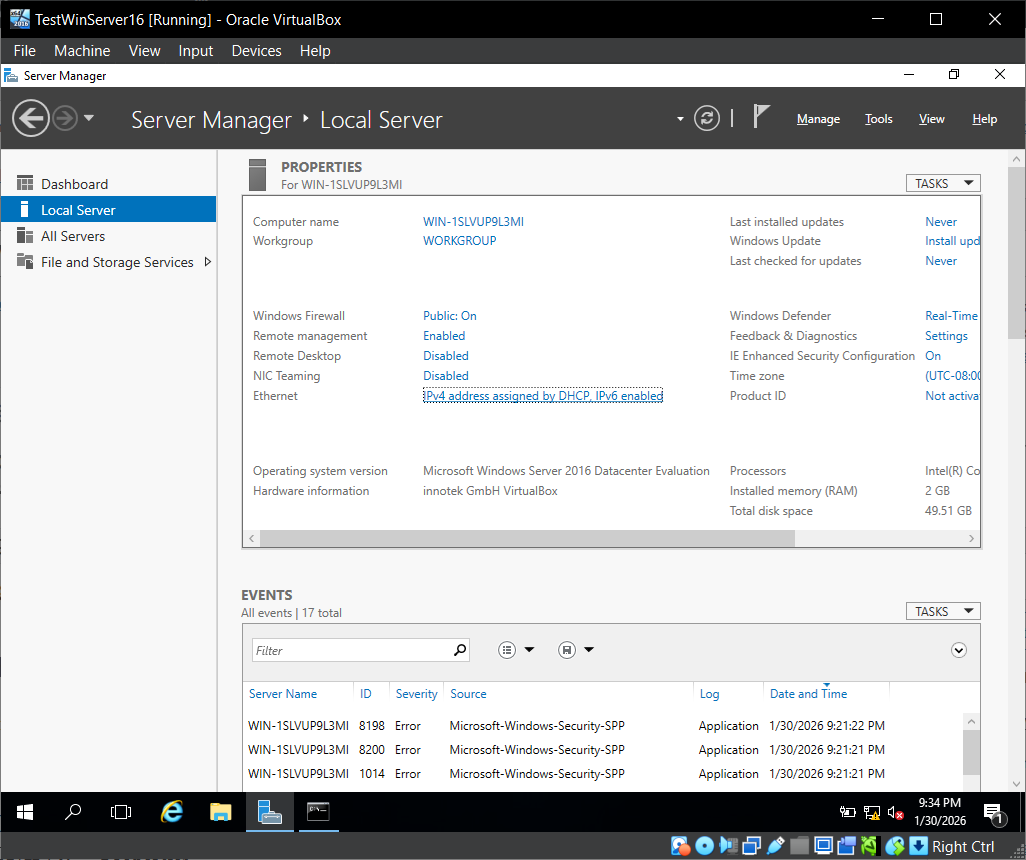 At this point, you should have Windows Server 2016 installed, Guest Additions working, network connectivity confirmed, and a properly renamed server ready for the next steps.