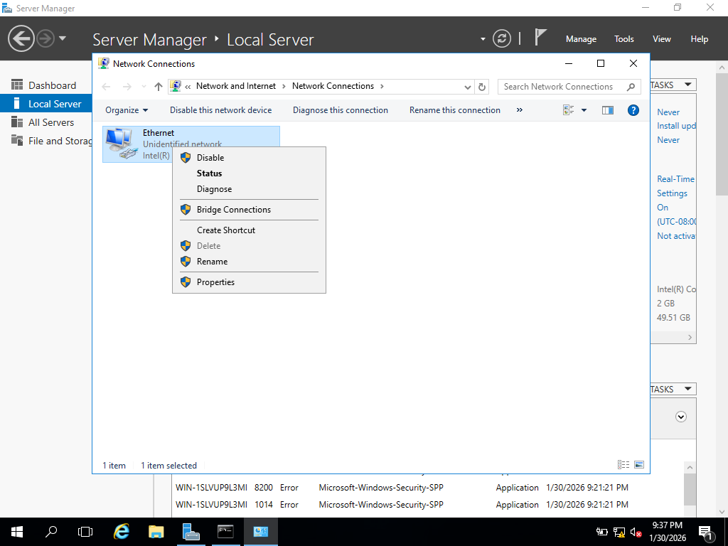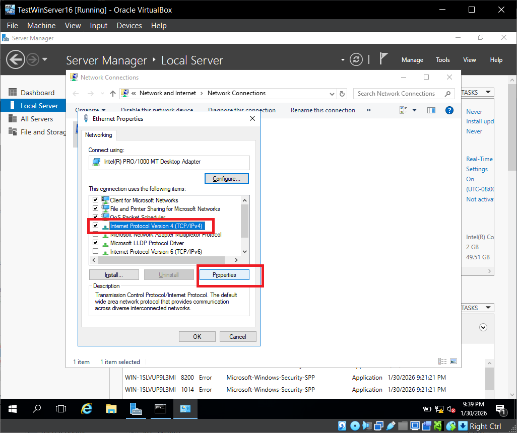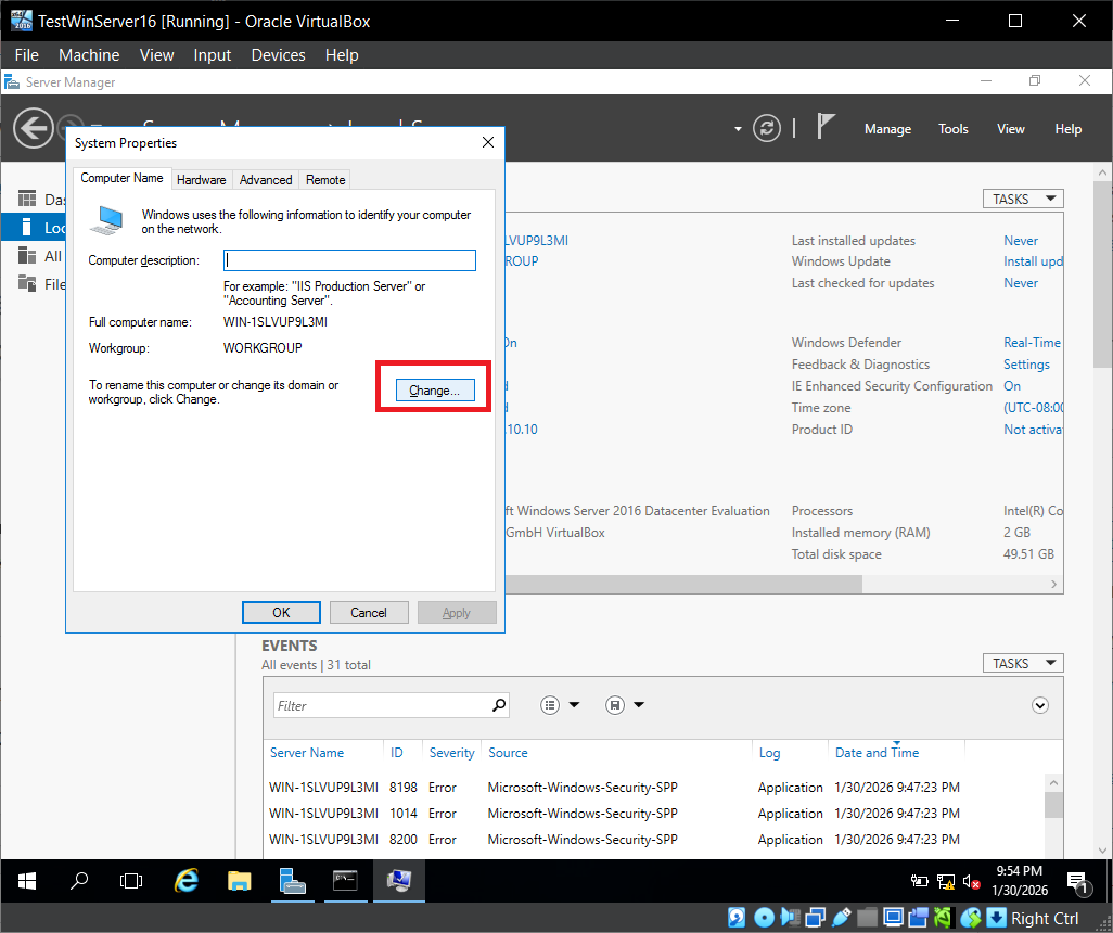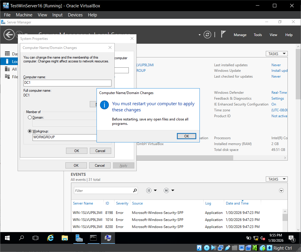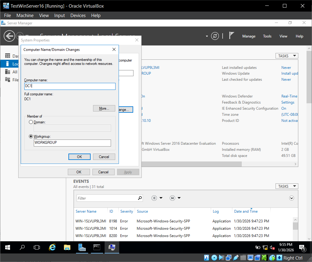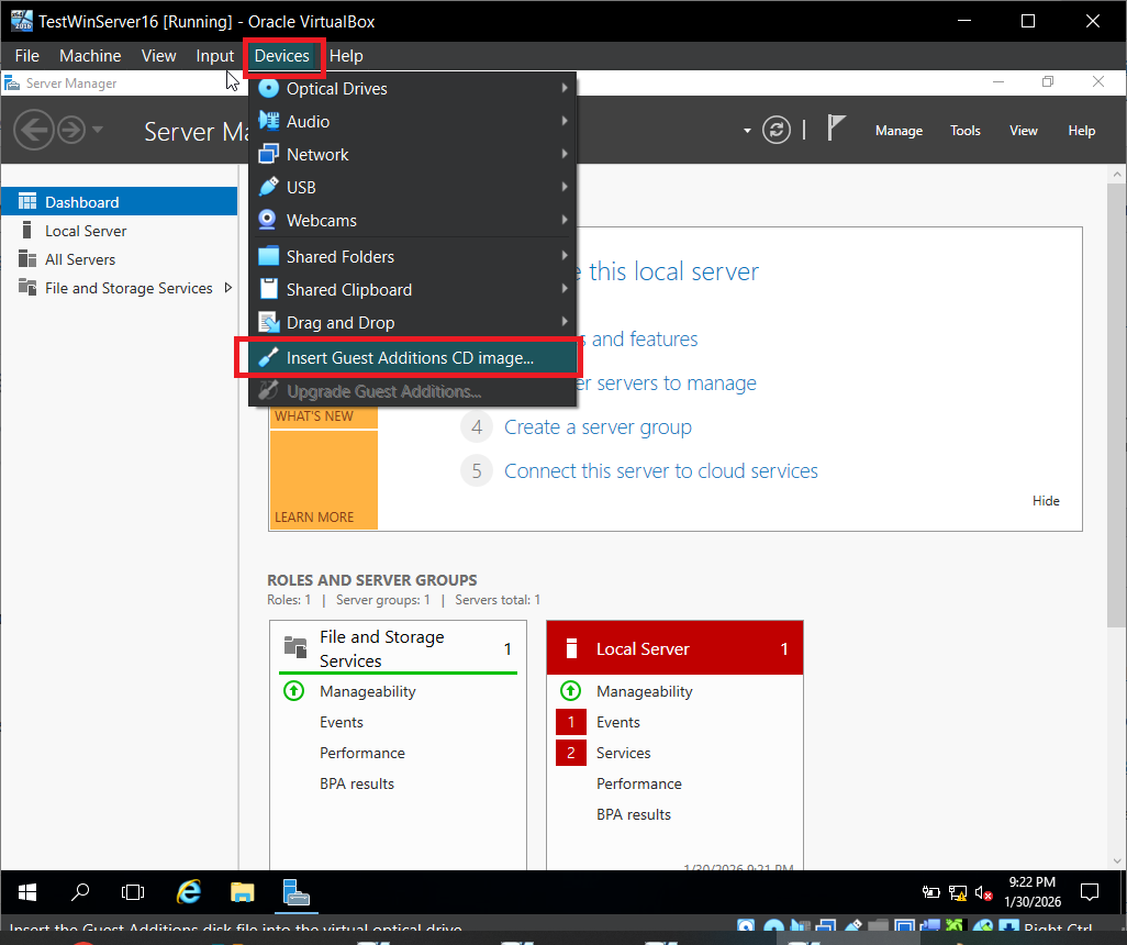 At this point, you should have Windows Server 2016 installed, Guest Additions working, network connectivity confirmed, and a properly renamed server ready for the next steps.
