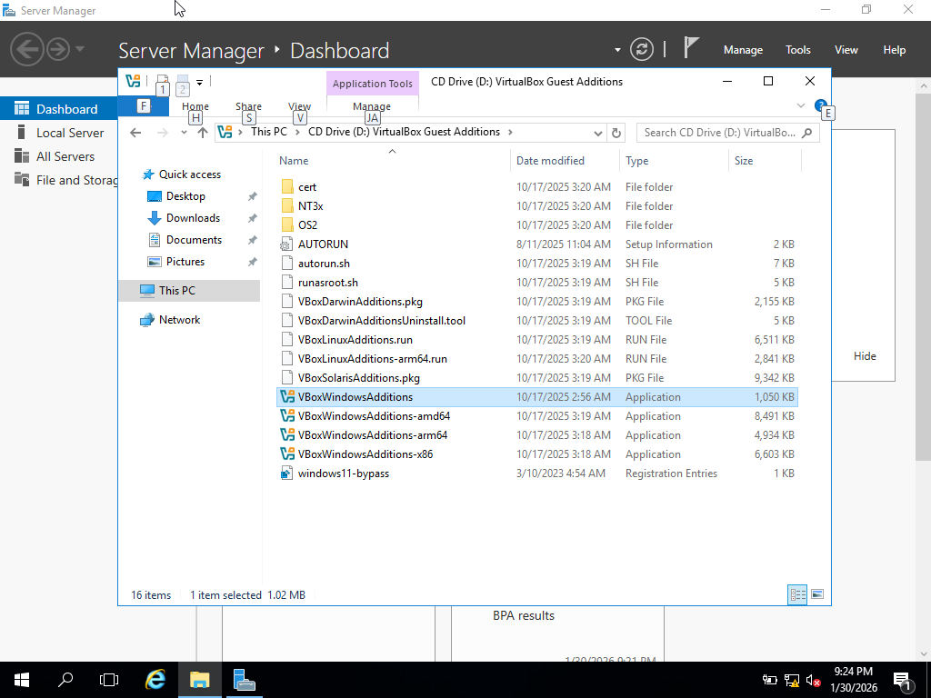 Open File Explorer → This PC → open the Guest Additions CD. Click through VBoxWindowsAdditions