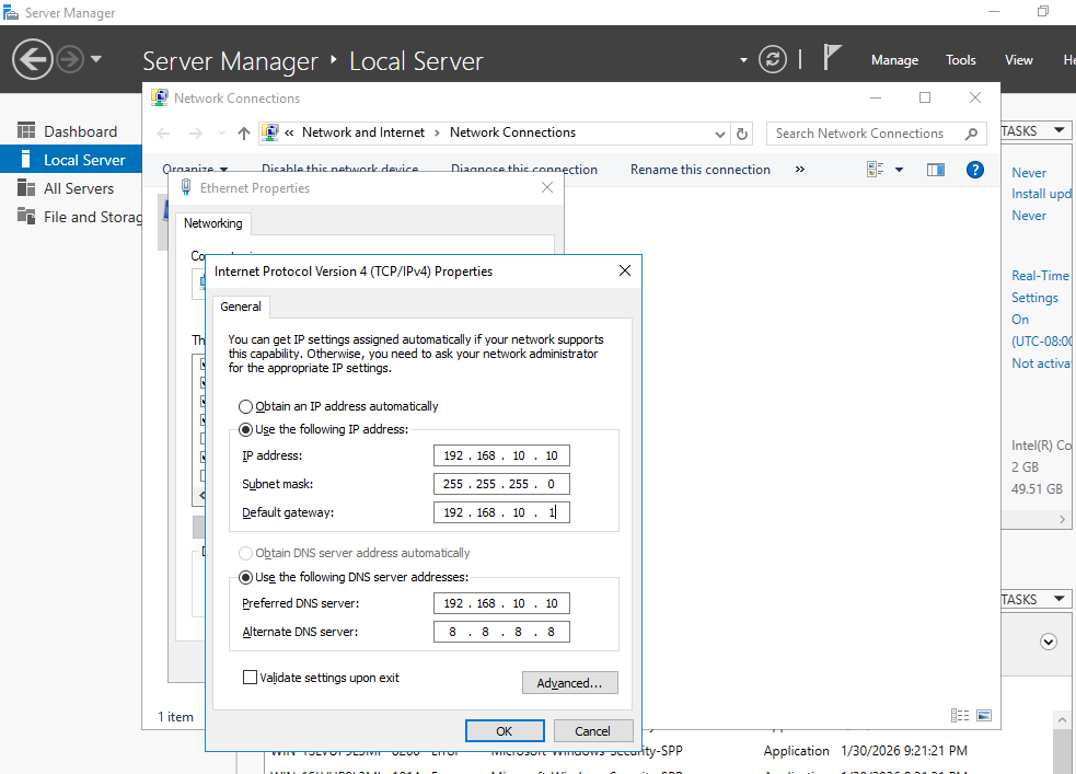 Preferred DNS: 192.168.10.10 (Seerve's own IP as it will also be our default DNS Server)